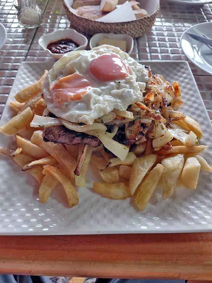 Comi uma excelente chuleta de “vacuno” ao “pobre”. Chuleta à cavalo, com uma fantástica batata frita.