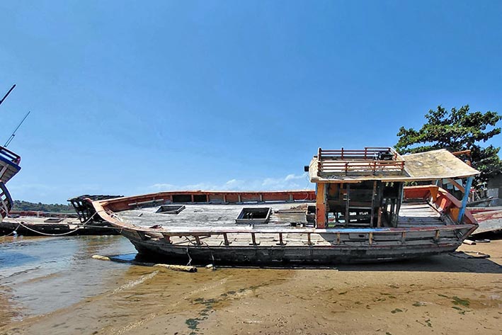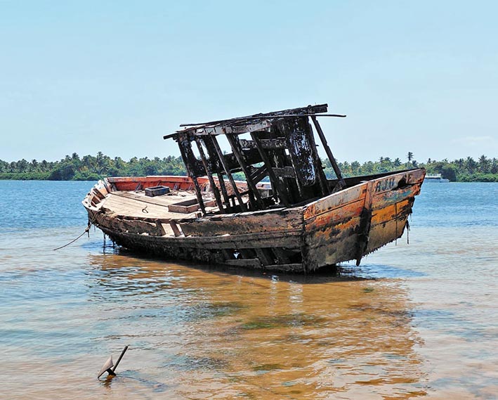 Me chamaram especial atenção as velhas embarcações em diferentes estágios de conservação. Uma morta, soterrada, vestígios. Outra irrecuperável, em decomposição aguardando o seu melancólico fim. A terceira, em recuperação, remendada para ganhar sobrevida até também sucumbir ao senhor dos senhores: o tempo.